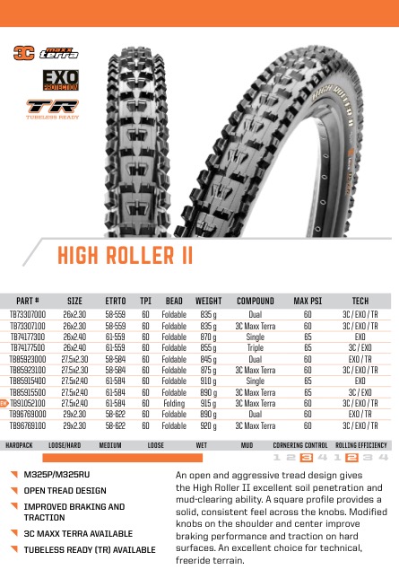 Maxxis kolesarski plašč High Roller II je najbolj vsestranski plašč. High Roller II jima dobre lastnosti zaviranja in bočnega oprijema in je odličen plašč za vse vrste terenov. High Roller II plašč lahko vozimo tako spredaj kot zadaj. Stranski rob skrbi za dobro lego v ovinkih. Poševno oblikovani čepi po sredini poskrbijo za majhno trenje in dobro čiščenje tudi pri vožnji po blatu.